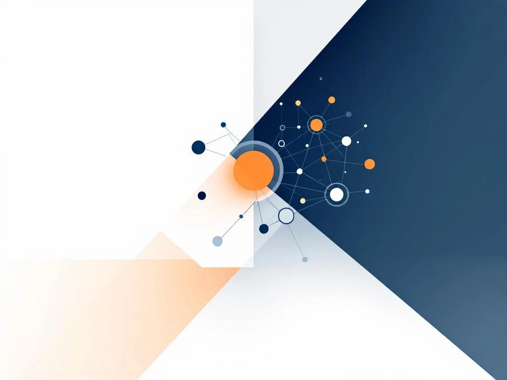 Geometrische illustratie met blauwe ERP-netwerknodes links en oranje CRM-klantrelatie-iconen rechts, gescheiden door diagonale lijn