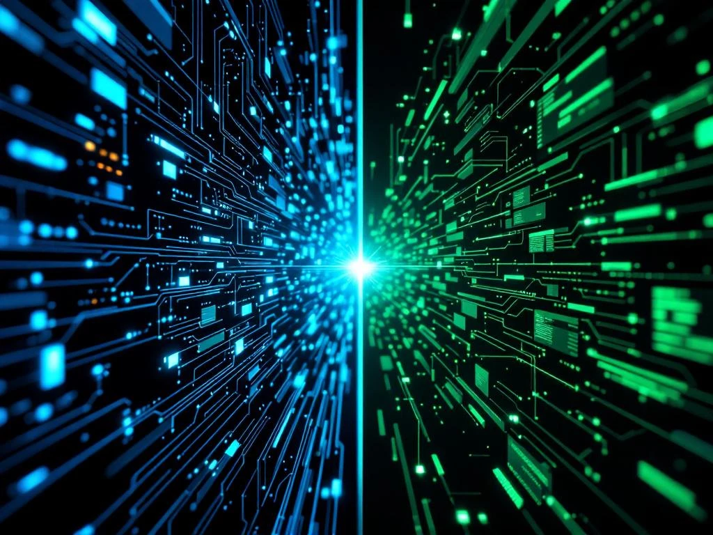 Split-screen vergelijking van complexe ERP-netwerken links en gestroomlijnde SAP-interface rechts met datastromen